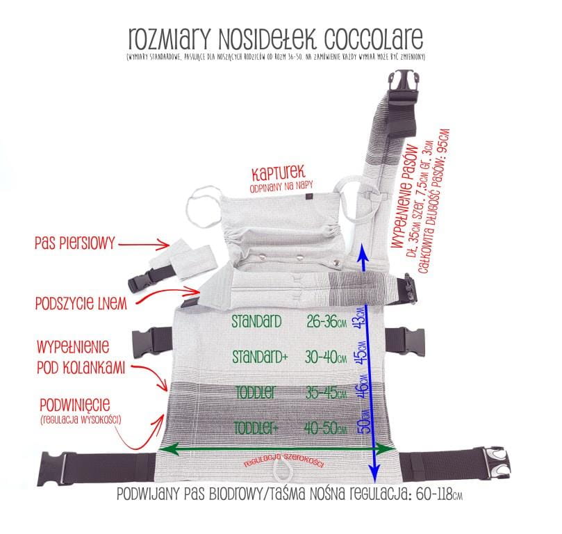 - nosidełko dostosowane dla osób w rozmiarze 36-50. Jeśli nosisz inny rozmiar lub chcesz krótsze/dłuższe/cieńsze/grubsze wypełnienie, dostosujemy nosidełko do Ciebie!