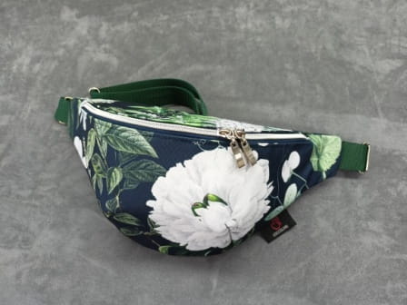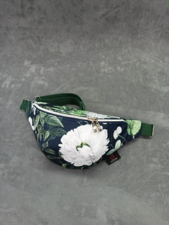Saszetka na biodro "nerka" z tkaniny wodoodpornej z motywem białych piwonii