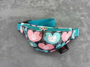 Saszetka na biodro "nerka" z tkaniny wodoodpornej z kocim motywem.