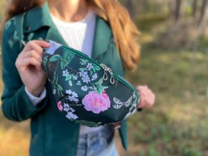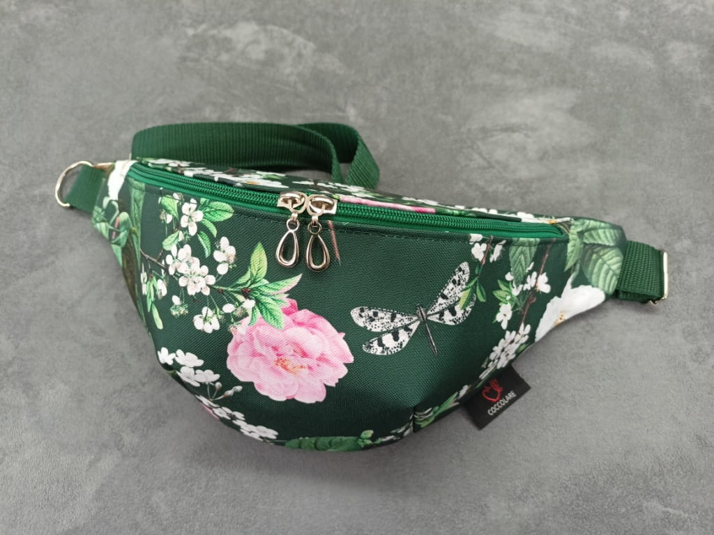 Saszetka na biodro "nerka" z tkaniny wodoodpornej z motywem kwiatowym na zielonym tle.