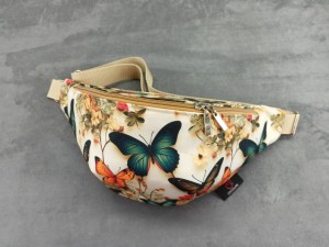 Saszetka na biodro "nerka" z tkaniny wodoodpornej z motywem motyli na beżowym tle.