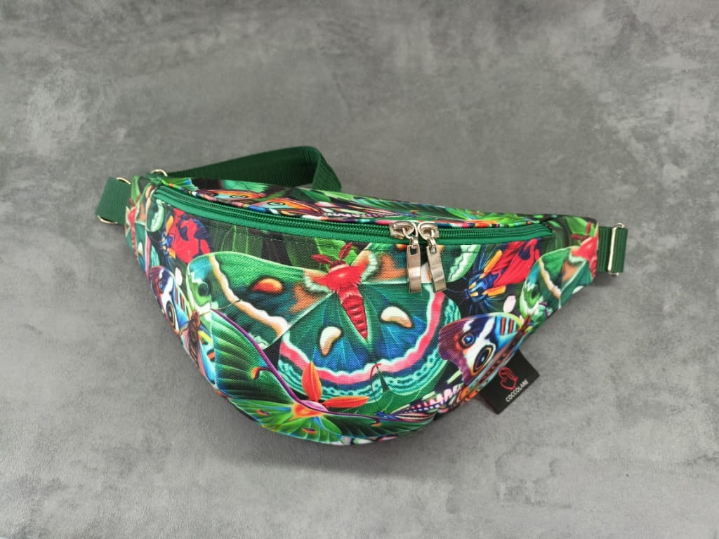 Saszetka na biodro "nerka" z tkaniny wodoodpornej z motywem motyli w zielonych odcieniach.