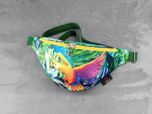 Saszetka na biodro "nerka" z tkaniny wodoodpornej z motywem papugi w liściach.