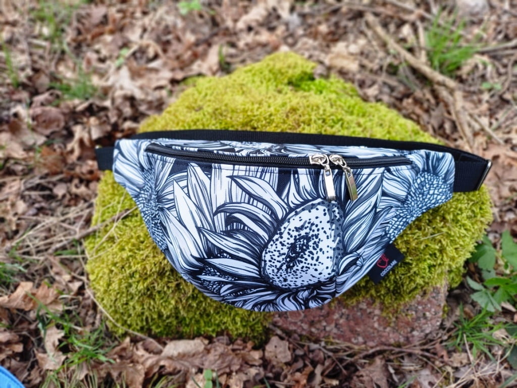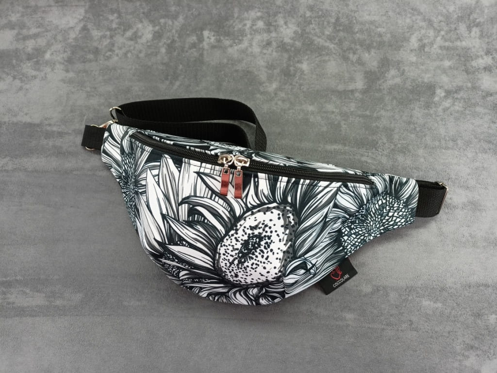 Saszetka na biodro "nerka" z tkaniny wodoodpornej z motywem czarno-białych słoneczników.