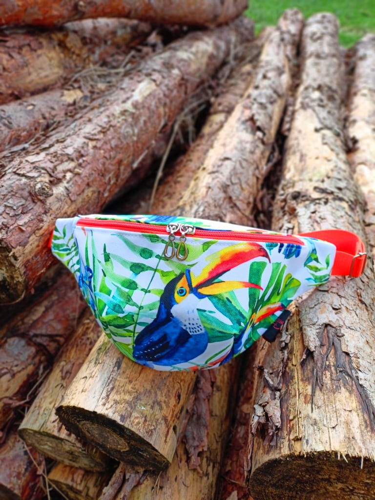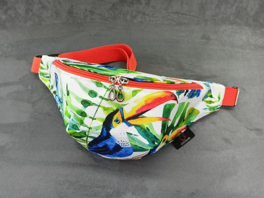 Saszetka na biodro "nerka" z tkaniny wodoodpornej z motywem tukanów.