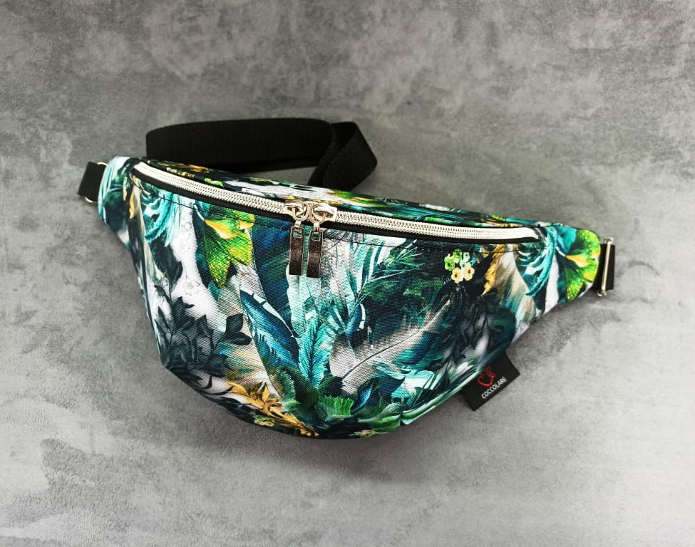 Saszetka na biodro "nerka" z tkaniny wodoodpornej z motywem turkusowych kwiatów.