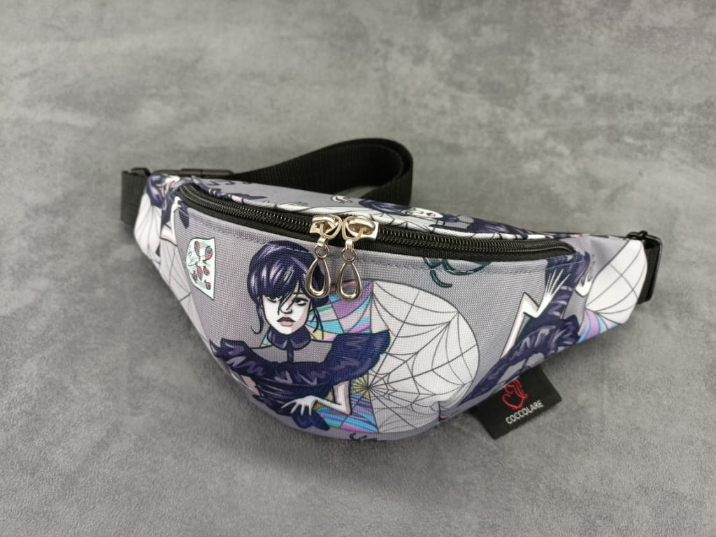 Saszetka na biodro "nerka" z tkaniny wodoodpornej z motywem mrocznej dziewczyny.
