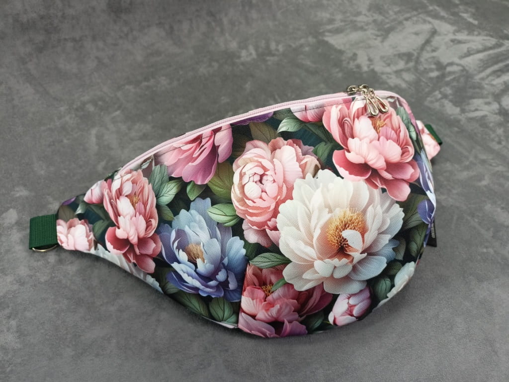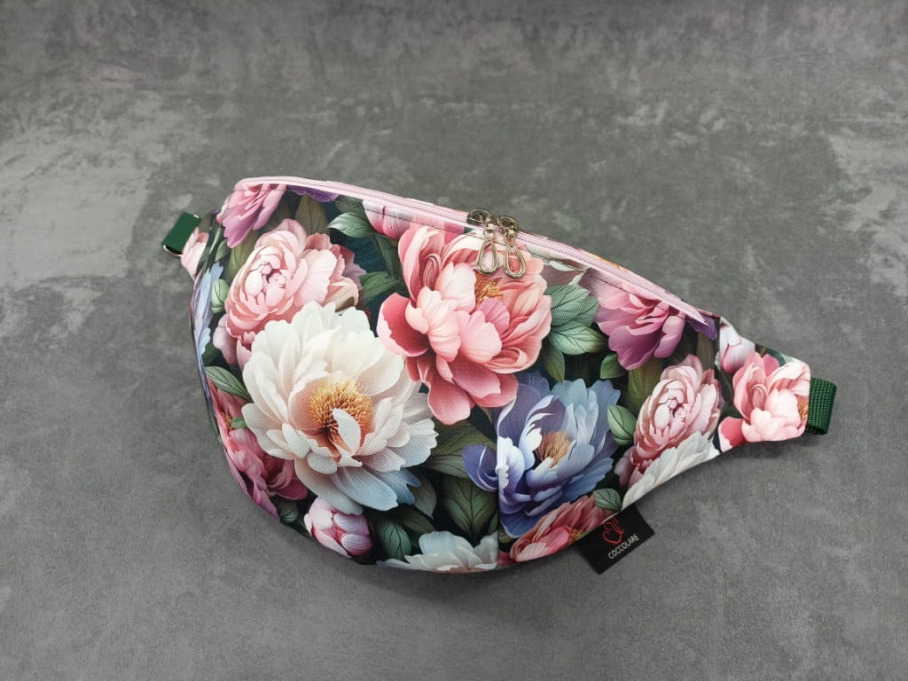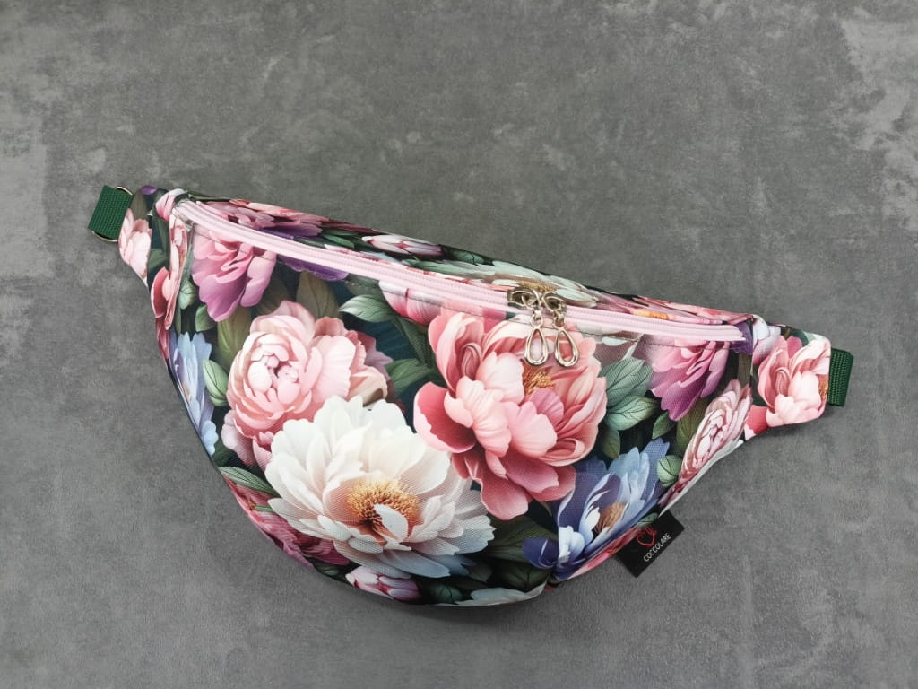 Saszetka na biodro "nerka" z tkaniny wodoodpornej z motywem wiosennych kwiatów.