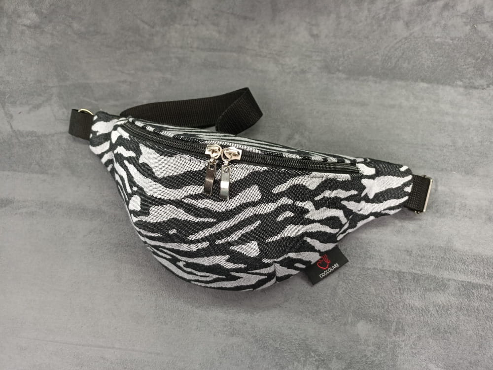 Saszetka na biodro "nerka" z chusty z motywem zebry + lniany tył.
