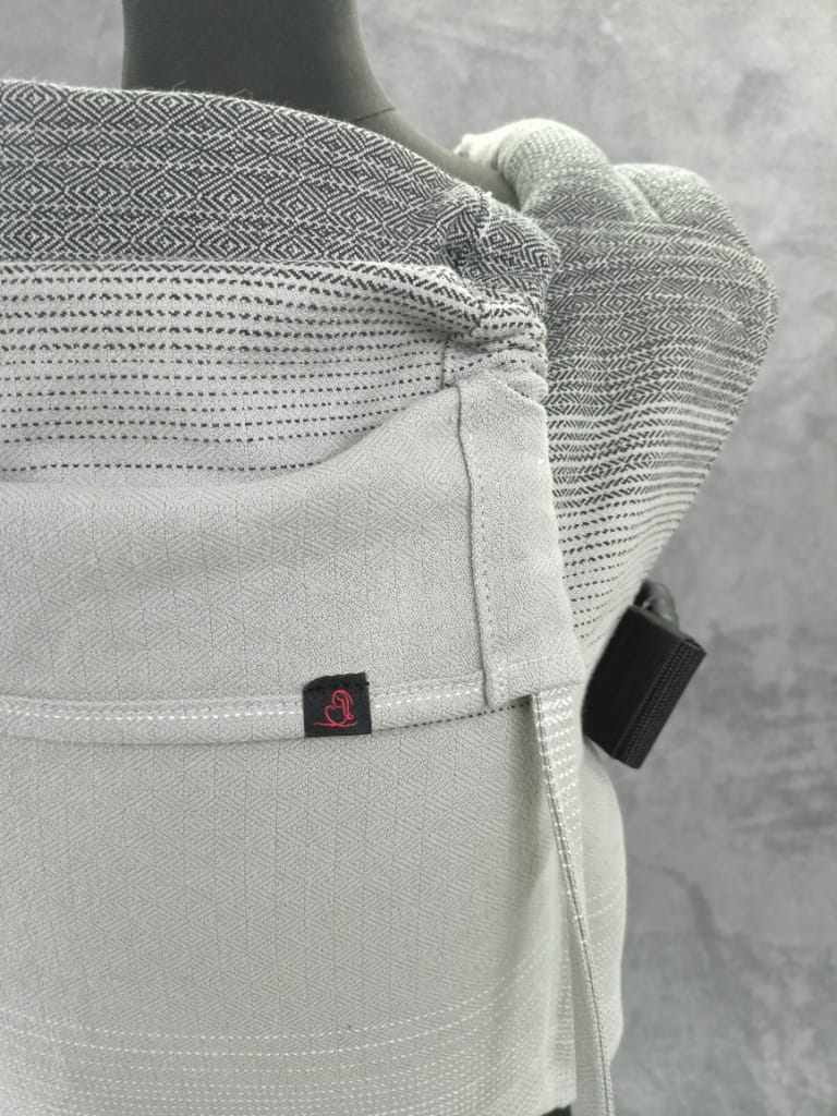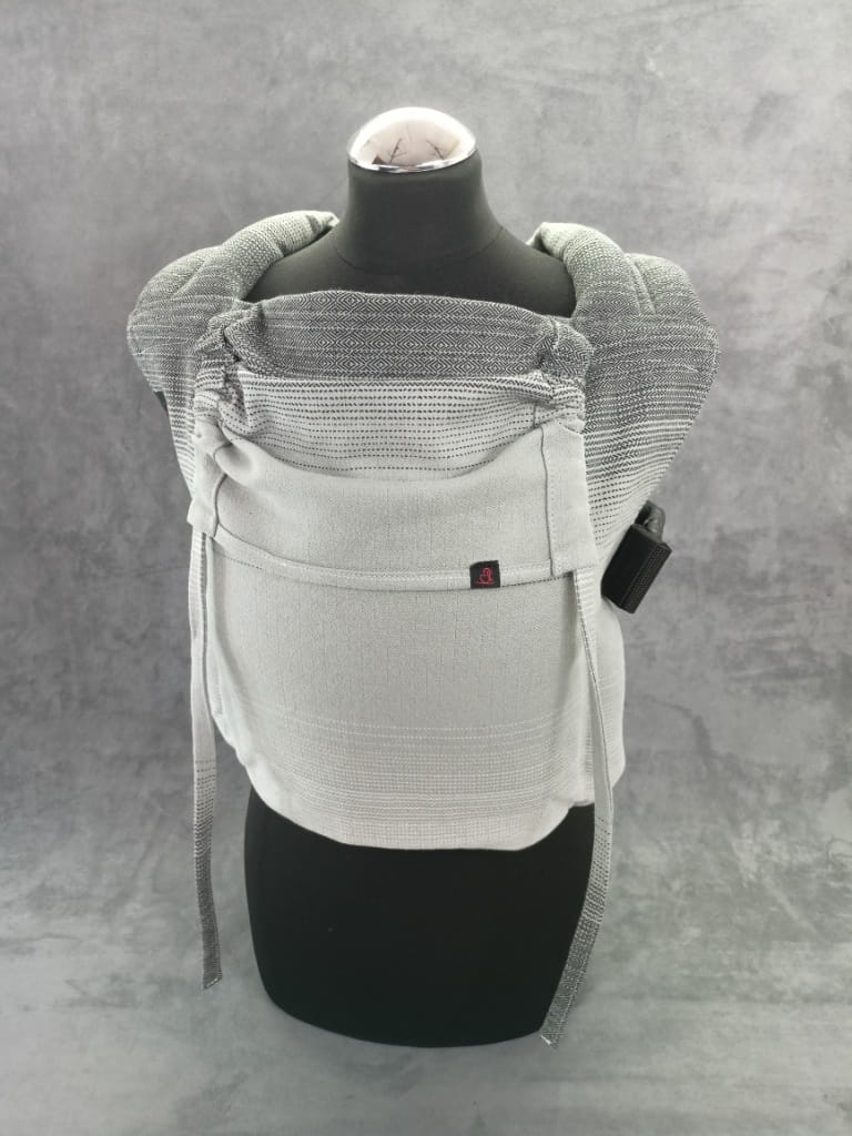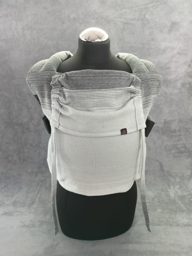 Nosidełko ergonomiczne klamrowe uszyte z chusty Celebes w odcieniach szarości.
